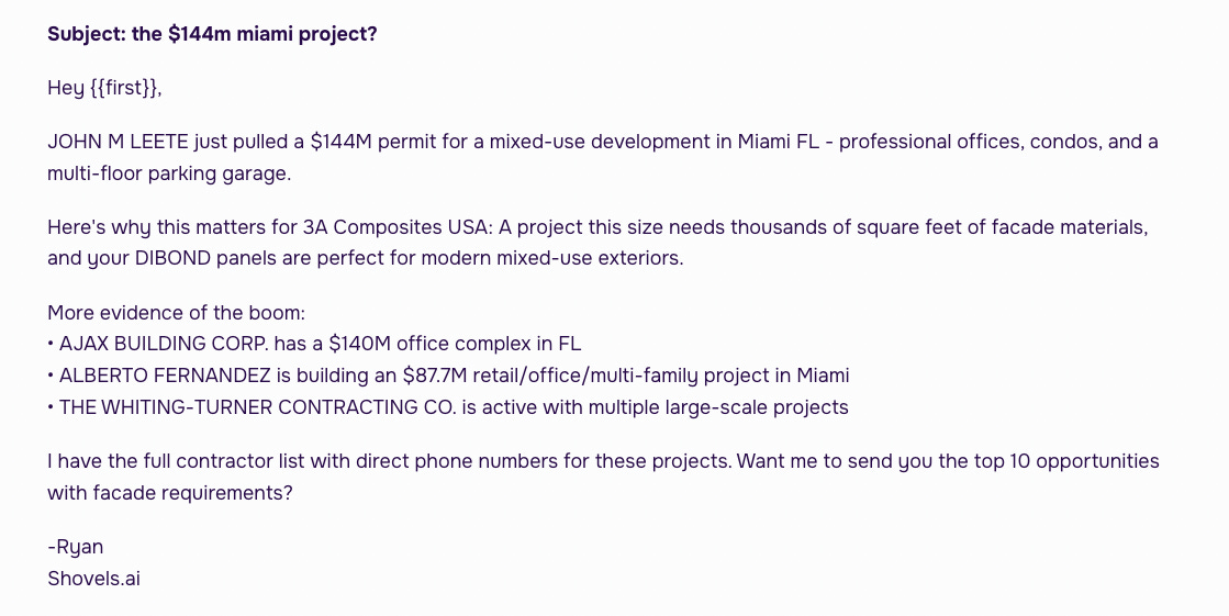 This isn't just lead generation—it's intelligence delivery. The prospect would pay to receive this information even if they never bought from Shovels.