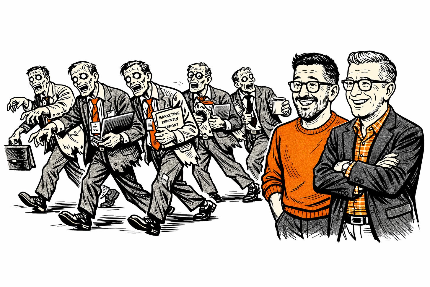 I know this because I’m the a zombie enabler too. I’m a fractional CMO working with multiple clients stuck in Stage 1, helping them navigate Stage 2, while Jordan is already living in Stage 3. I see the future every day, and then I go back to organizations that are still arguing about MQL definitions. FML.